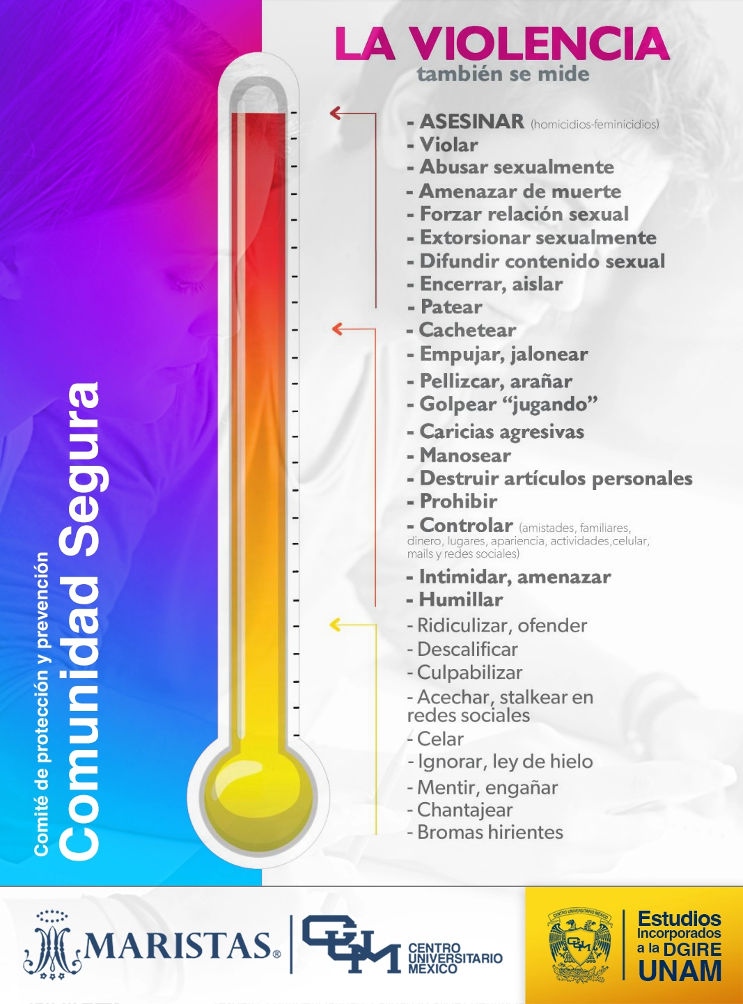 El Centro Universitario México, A. C., como parte de la Red Internacional de los Colegios Maristas está avanzando hacia la construcción de un ambiente libre de cualquier forma de violencia contra cualquier miembro de la comunidad, especialmente contra las niñas, niños y adolescentes que la Providencia nos ha confiado.